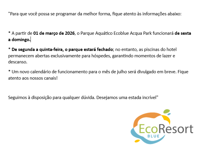 | Parque Aquático | Acesso incluso para todos os hóspedes do hotel. |